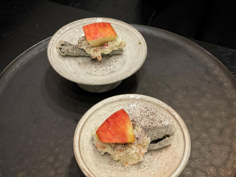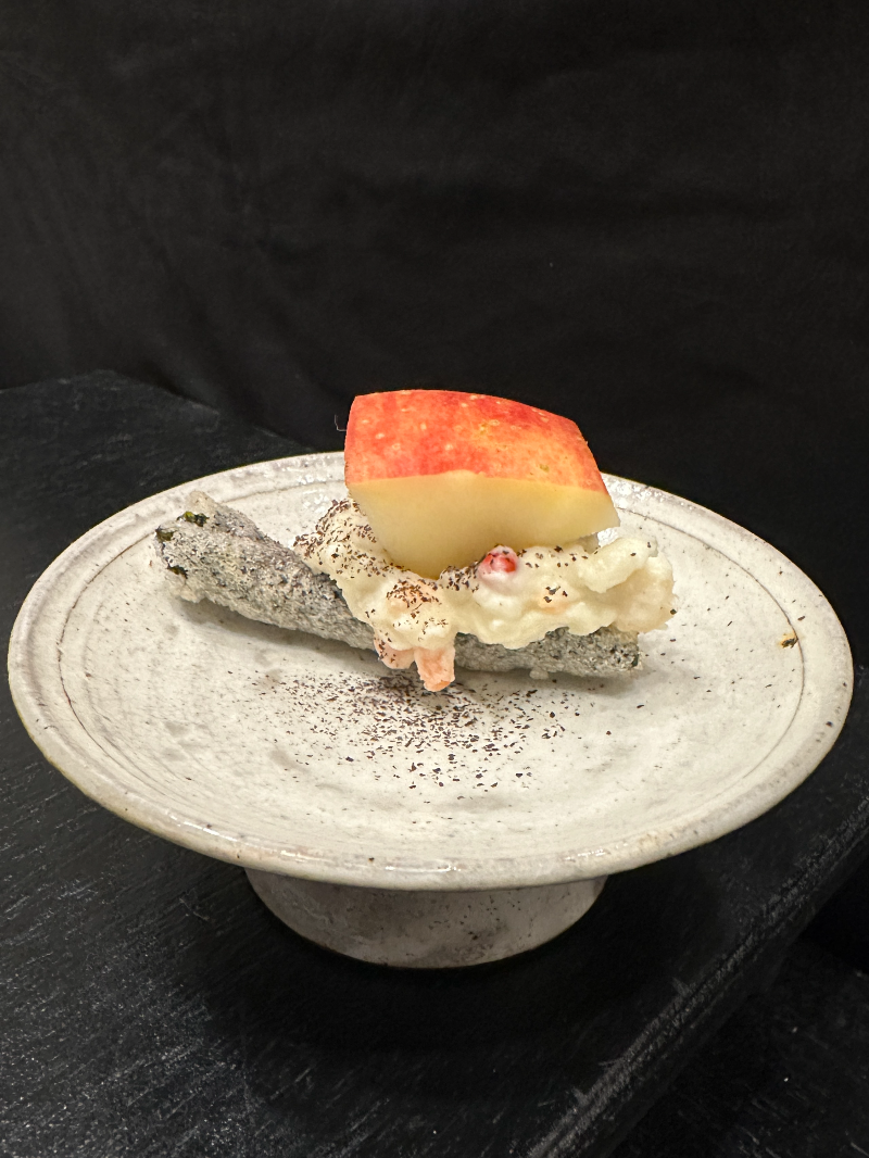 짭조름한 김부각 위에 감자샐러드, 사과가 올라갔습니다.