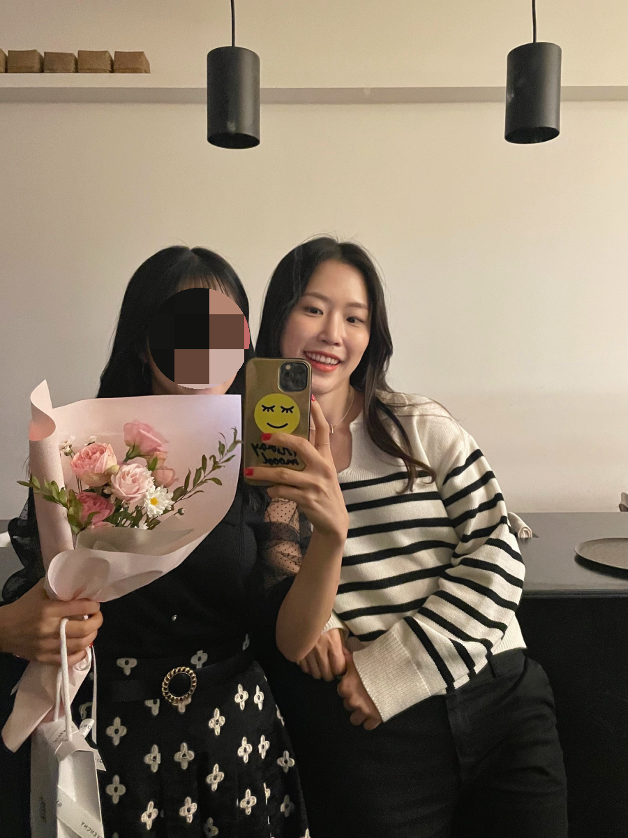 꽃다발과 함께 선물 준비해서 친구네 집으로 먼저 갔는데, 사진 찍으려고 챙겨서 티이에 왔답니다ㅎㅎ