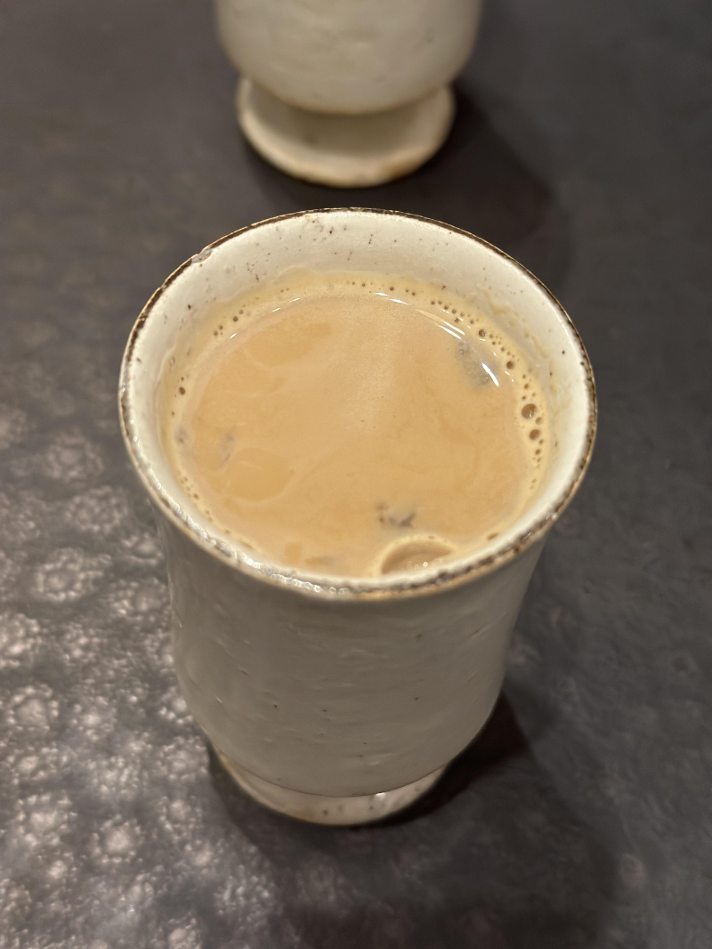 호지차를 듬뿍 넣고 우려서 만든 밀크티예요.