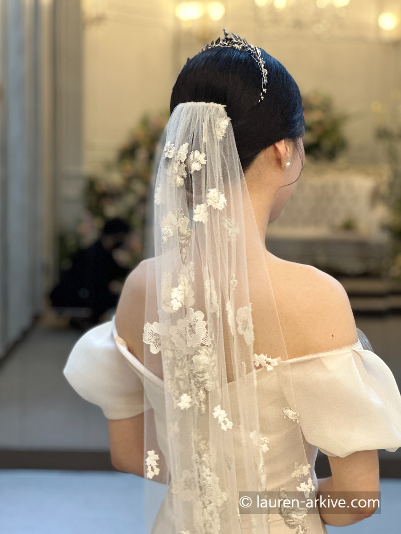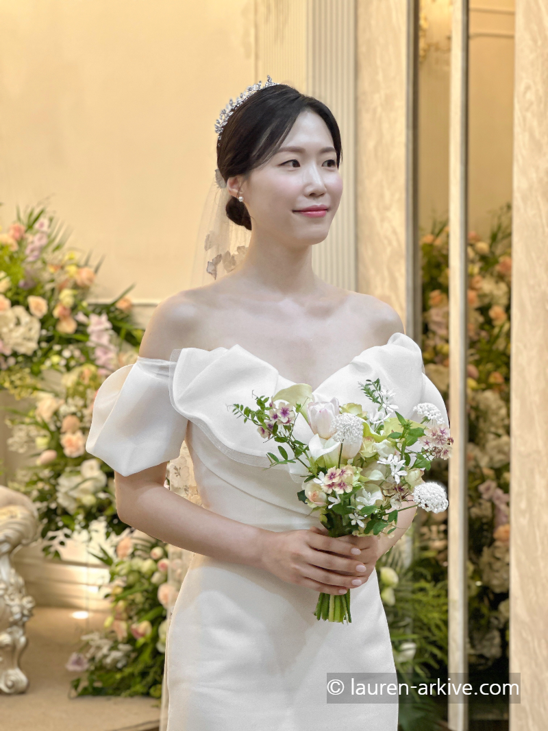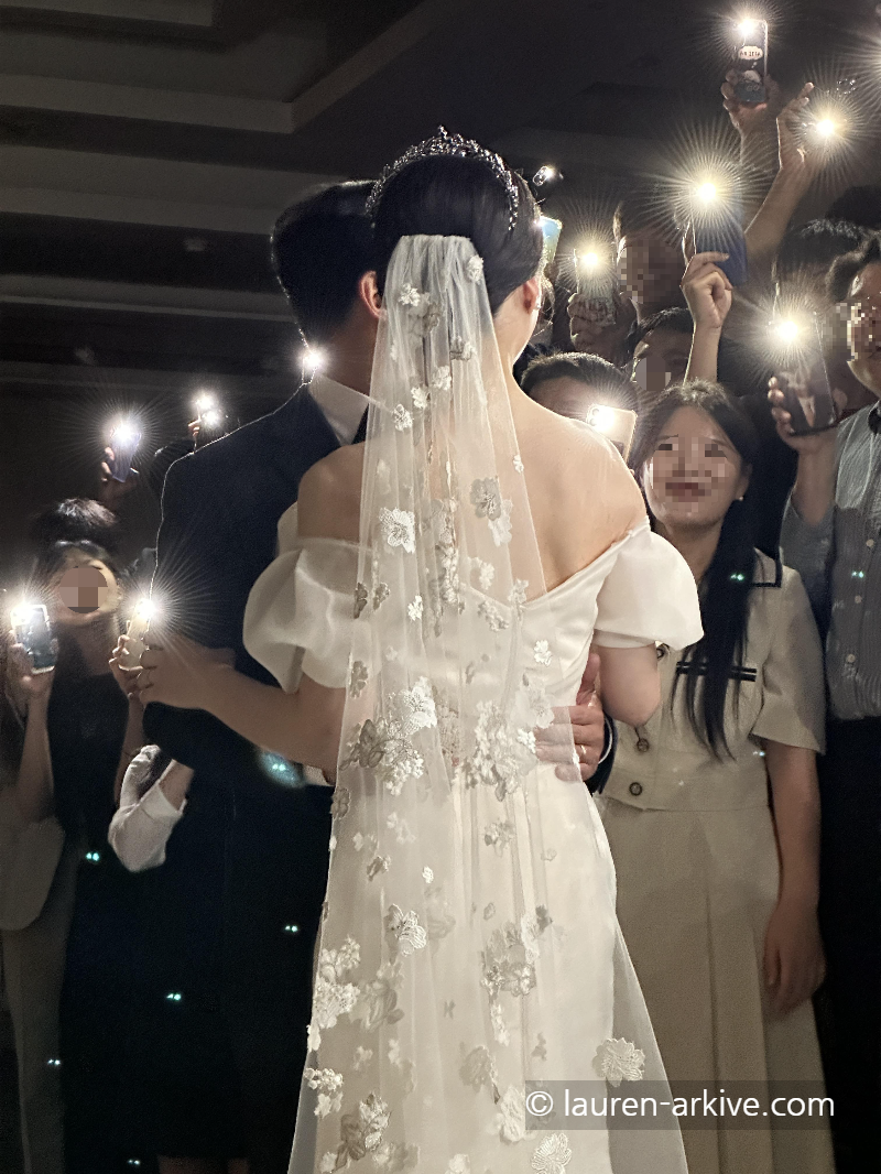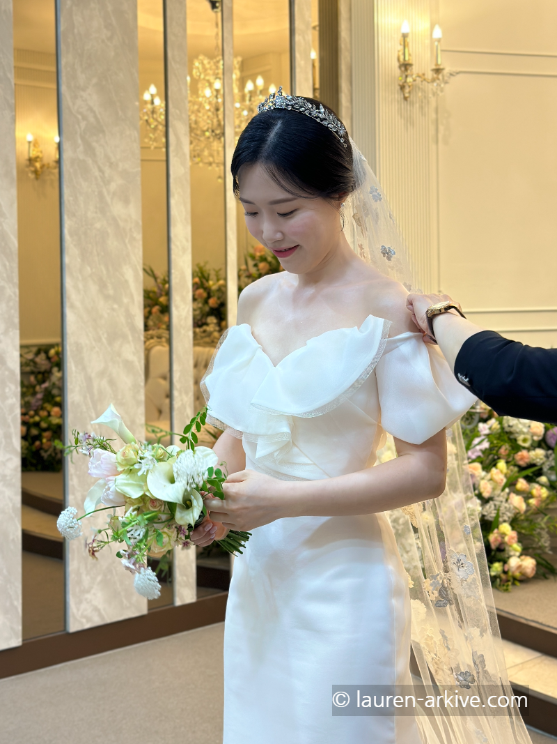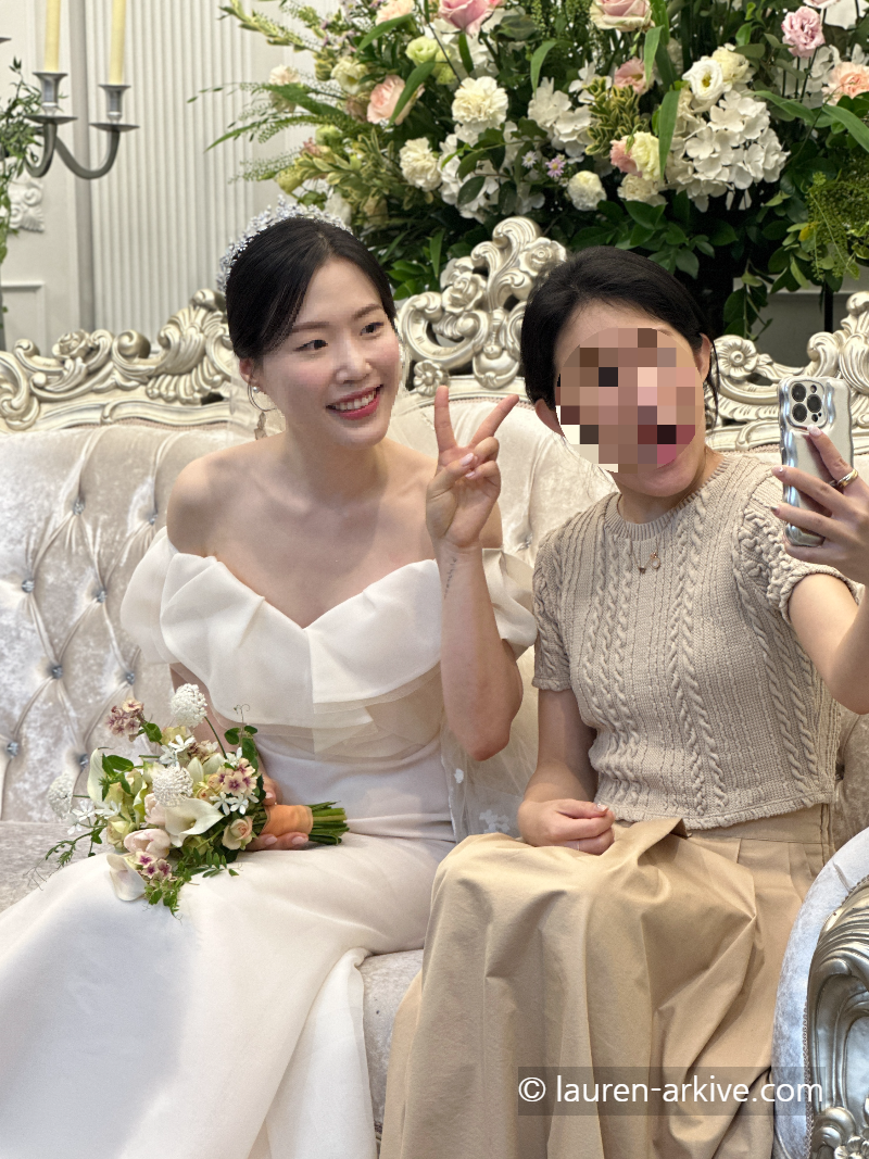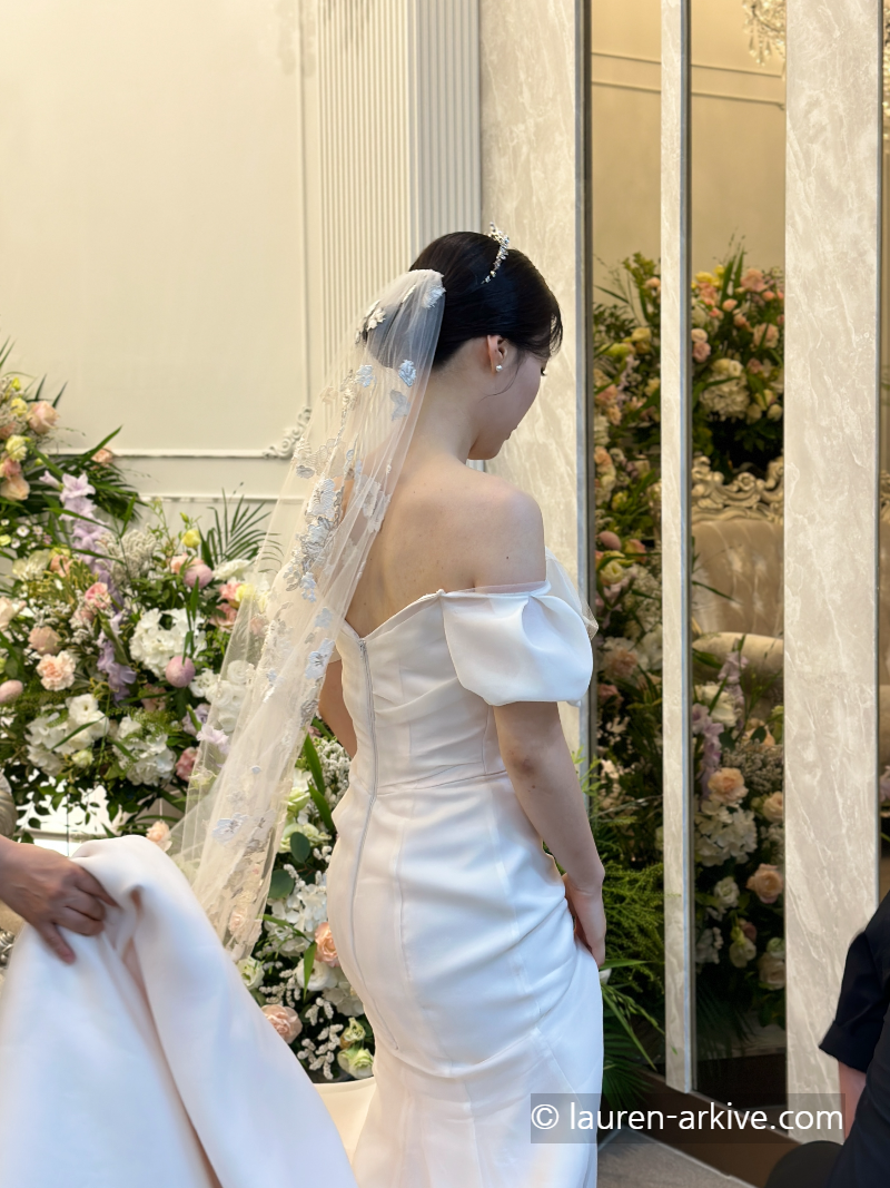 지금까지는 약속을 너무 잘 지켜주고 있네요🤭 위에 베일 장식 때문에 너무 고급스러운 분위기가 나서 좋아요. 입었을 땐 잘 못 느꼈는데 이 사진을 보니 제 드레스의 피치톤이 엄청 잘 살아나있네요!