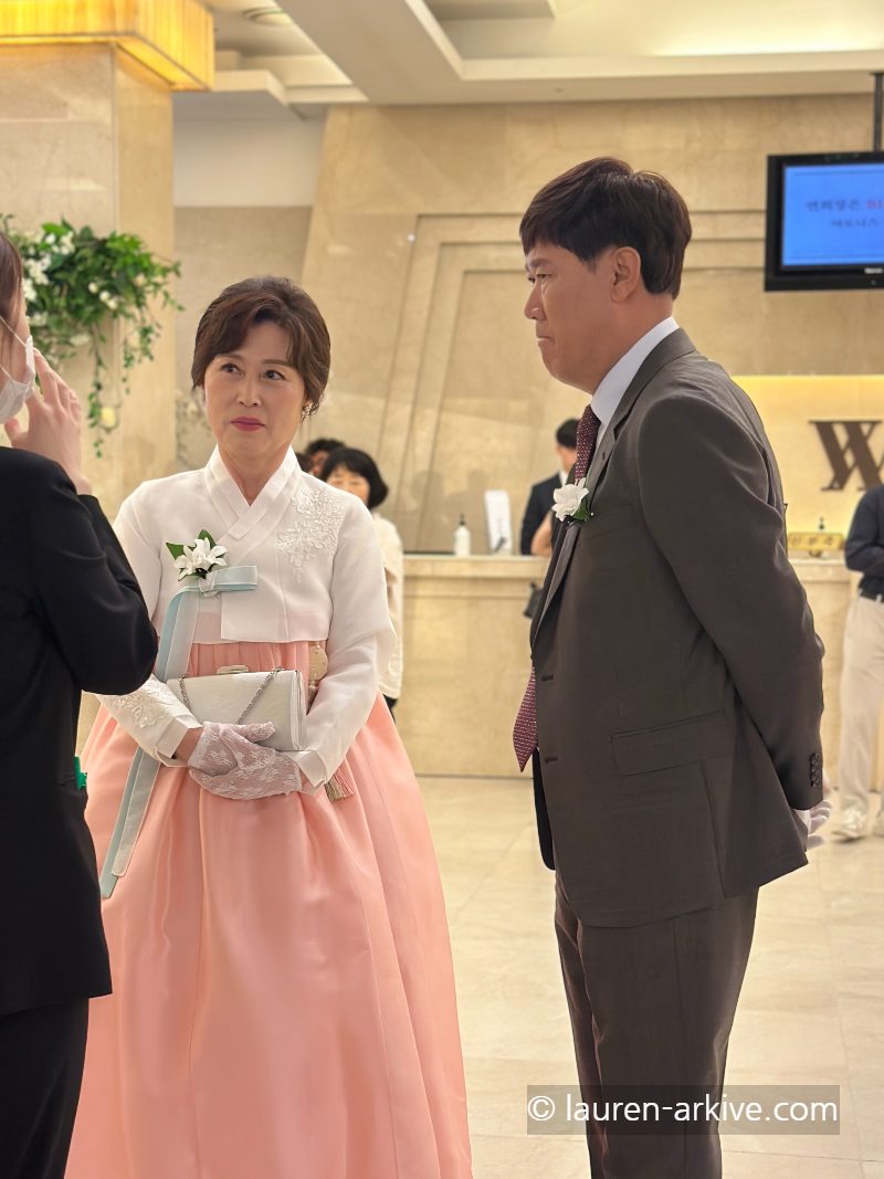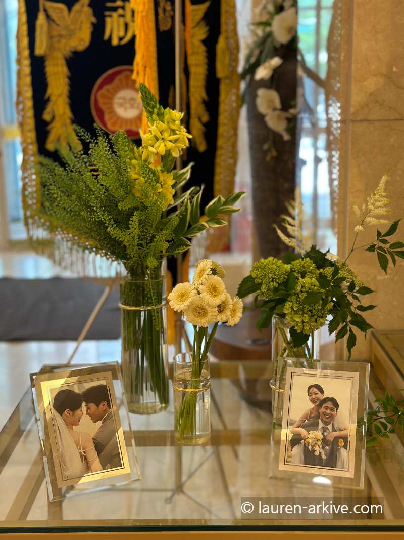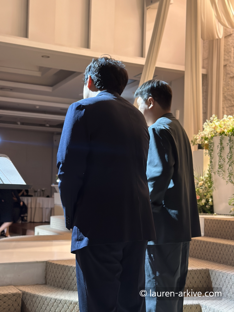 로비부터 홀 안쪽까지 바닥이 모두 화이트톤 대리석이라서 전체적으로 화사하고 밝은 느낌이에요. 그리고 저희는 건물 1층 로비 전체를 다 썼기 때문에 아주 널찍하니 좋았습니다. 접수대도 넓어서 축의금 받아주시는 친척 분들이 편하다고 하셨어요. (든든한 남표니와 사랑하는 아빠 엄마ㅎㅎㅎ)