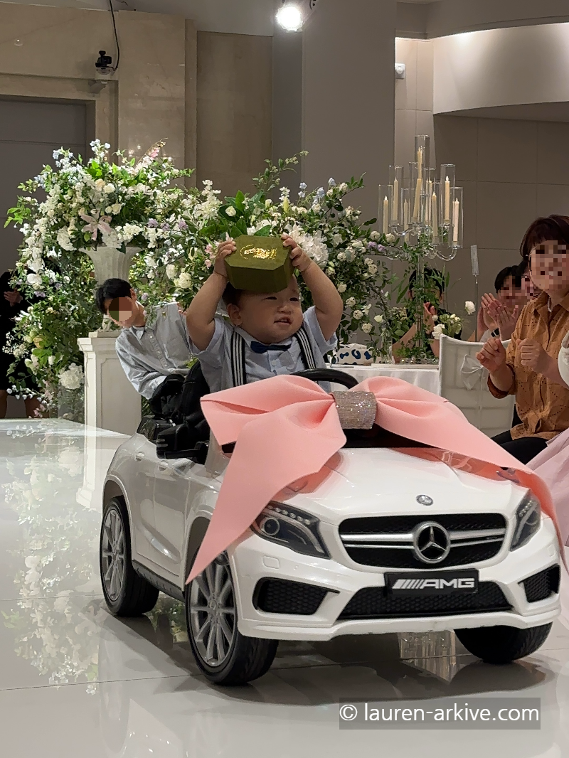 예물 교환 순서에는 저의 매력만점 시조카 시율군이 화동을 해주었어요. 너무 귀엽죠!! ㅎㅎㅎ 전동차는 저희가 따로 빌린 거고요. 이때만 해도 갓 돌 지났을 때라 걷거나 스스로 전동차를 움직일 수는 없으니ㅎㅎ 아주버님이 리모컨으로 운전해주셨습니다ㅋㅋㅋㅋ
