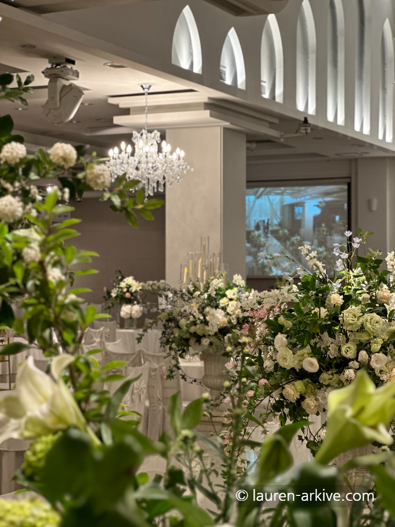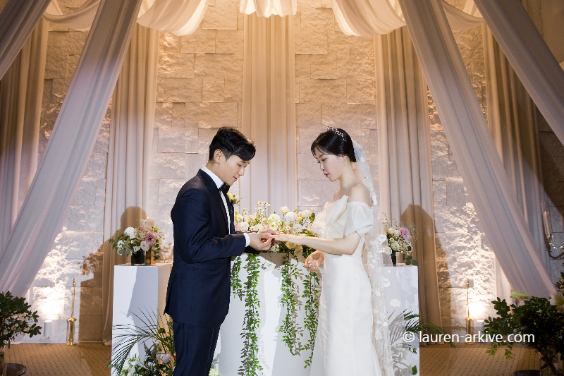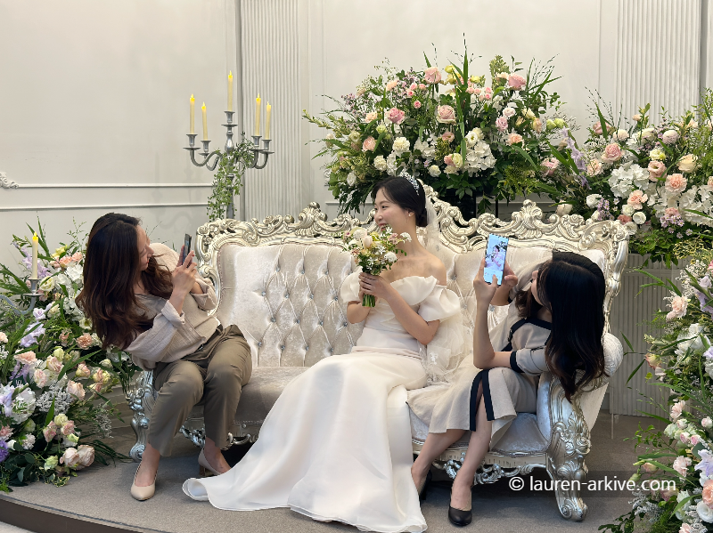 신부대기실은 로맨틱한 감성이 가득 담겨있는 곳이에요. 바닥부터 천장까지 깔끔한 화이트 & 베이지 톤, 샹들리에와 은은한 조명들도 많구요. 그리고 벨벳 소재의 의자까지~ 벽에는 살짝 반투명 (글로시한) 거울이 군데군데 있어서 생화 장식을 비추니 더 고급지더라고요.그리고 대기실 안쪽에 전용 화장실이랑 파우더룸도 갖춰져 있어서 이용하기 무척 편하고 좋았어요.
