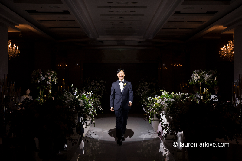 그리고 오늘의 주인공! 신랑 신부 입장 순서입니다ㅎㅎ 화이트베일홀이 전체적으로 밝고 화사한 느낌이라고는 하지만 이렇게 단독 입장할 때는 주인공이 돋보일 수 있도록 조명을 조절해 주세요. 한꺼번에 많은 사람들이 쳐다보니 엄청 떨리고 긴장될 줄 알았는데, 조명이 어둡다 보니 하객분들 얼굴은 하나도 안 보이더라고요ㅎㅎ 천천히 걸으라는 헬퍼 이모님 말에 드레스 발로 뻥뻥 차면서 즐기면서 입장했던 기억이 나요😍 이 순간 하나 때문에 드레스도 여러 벌 입어보고 비싼 메이크업도 받았는데, 막상 걸어 나가면 체감상 딱 5초? 정도 되었던 것 같네요😂😂