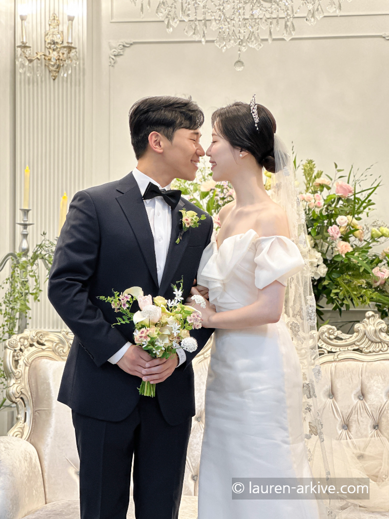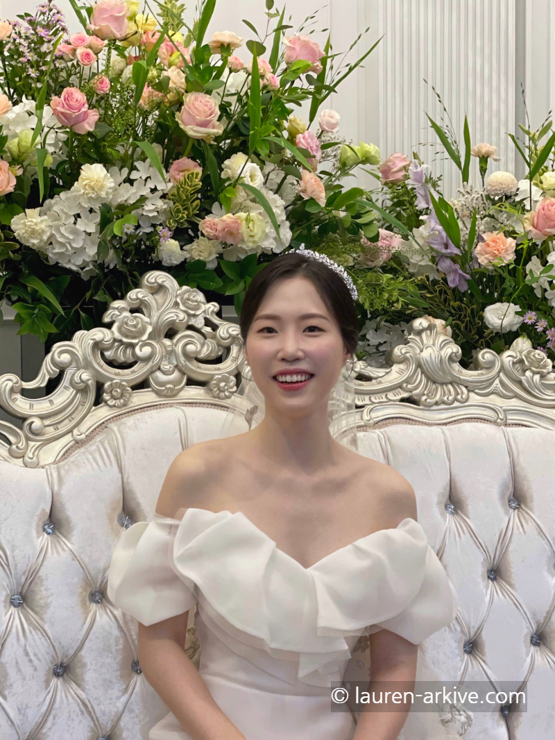 무엇보다 생화장식 색 구성이 너무 맘에 들었어요. 어쩜 맞춘 것도 아닌데 제 부케랑 너무 찰떡이었던 거 있죠?💐 마치 꽃을 같은 화훼농원에서 따온 것 마냥ㅎㅎㅎ 그리고 앉아있는 동안 생화 냄새가 너무 향긋해서 기분이 좋아지더라고요. 제 드레스 색도 아주 살짝 피치톤이 섞여있어서 더 잘 어우러졌던 것 같아요. 🌸🌸