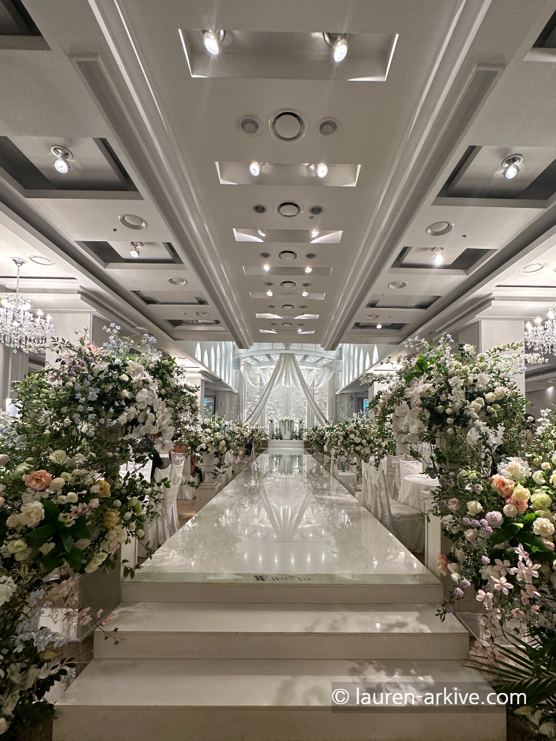 천장에는 기다란 베일이 드리워져있고, 샹들리에 장식이 화려하게 빛나고 있어서 웅장함마저 느껴지더라고요. 이 하얀색 베일 때문에 홀과 결혼식장 이름이 더화이트베일이라고ㅎㅎ 여긴 이 베일 장식 때문에 유명하다고 하더라고요?! 드라마 촬영 장소로도 여러 번 나왔고, 실제로 연예인들도 이곳에서 결혼식을 많이 올렸다고 해요. 가장 최근에는 '힘쎈여자 도봉순'에서 박보영 박형식 배우의 결혼식 장면으로 나왔다고 하네요. 그리고 이 베일 연출 때문인지 천고가 엄청 높아요! 그래서 좀 더 고급스럽고 웅장한 느낌이 들었던 것 같아요.