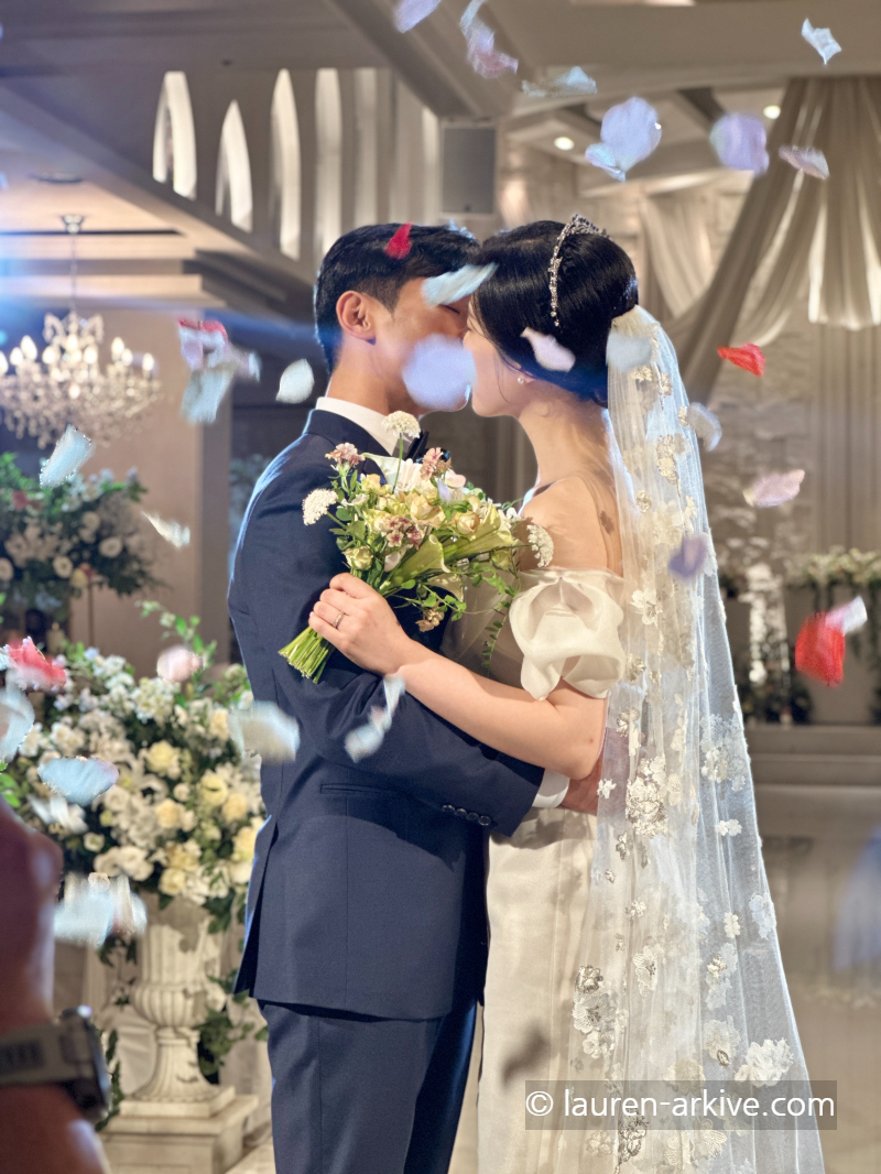 마지막 행진 후 결혼식이 다 끝난 장면이네요~ 이때는 이제 사진을 엄청나게 많이 찍어본 단계라 사진작가님이 '뽀뽀👄' 하시면 자동으로 예쁜 각이 딱! 나오는 단계입니다ㅋㅋㅋㅋ👩🏻❤️👨🏻 생각보다 엄청 밀착된 자세여야 사진이 예쁘게 나와서 연습이 필요하더라구요.