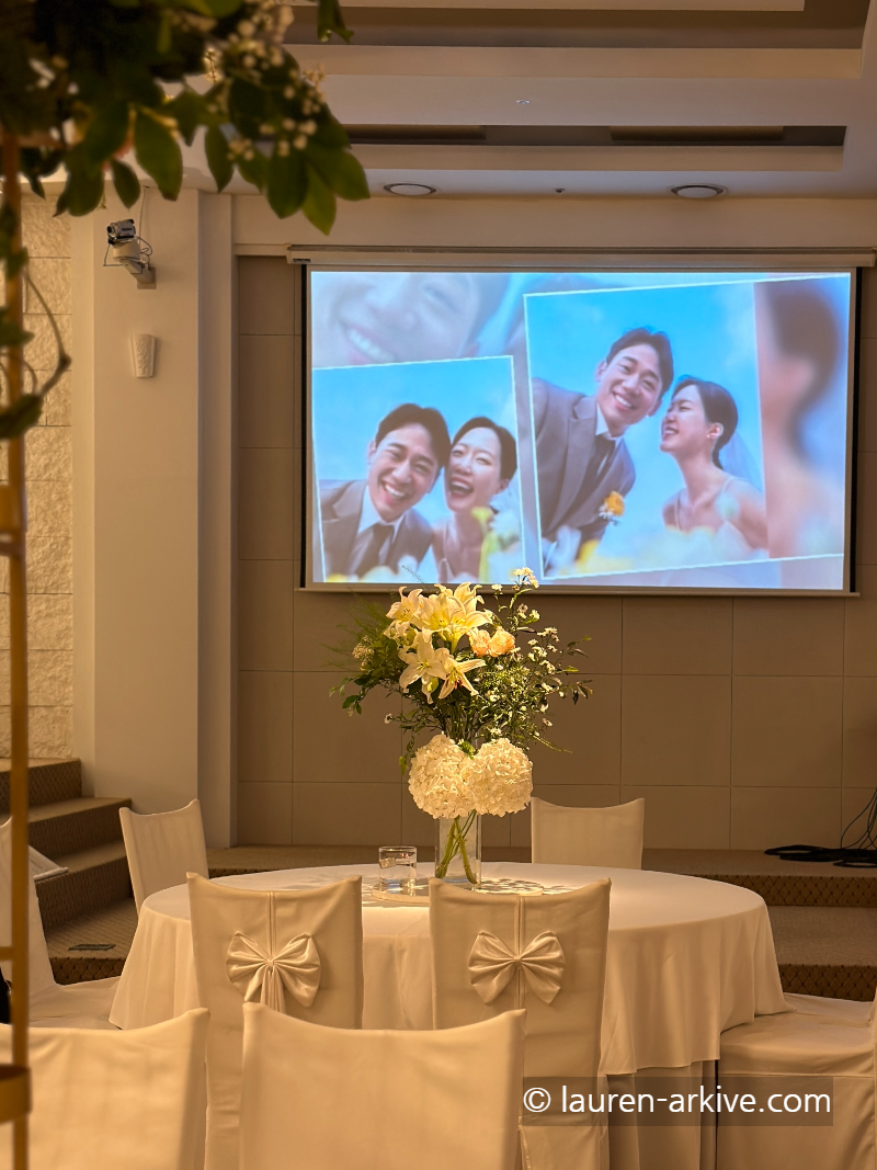 하객석은 200석 규모로 원형 테이블로 세팅되어 있는데 간격이 넓어서 동선이 편했어요. 식장 가장 앞쪽 가족석은 따로 푯말이 세워져 있어서 지방에서 먼 길 와주신 친척 분들이 자리 찾아 앉기 편하셨다고 해요. 앉을 수 있는 의자가 200석이고, 수용 인원은 최대 950명이라고 하니, 작을까 봐 걱정 안 하셔도 될 것 같아요. 사업하시는 분들은 하객이 엄청 많으시던데, 남편과 저는 평범한 직장인이라ㅎㅎ 보통 많이들 하는 정도의 식장 규모였습니다. 테이블 위에 생화 장식도 너무 예쁘죠! 식 전에는 저희가 준비한 식전영상이 계속해서 나오고 있었어요.
