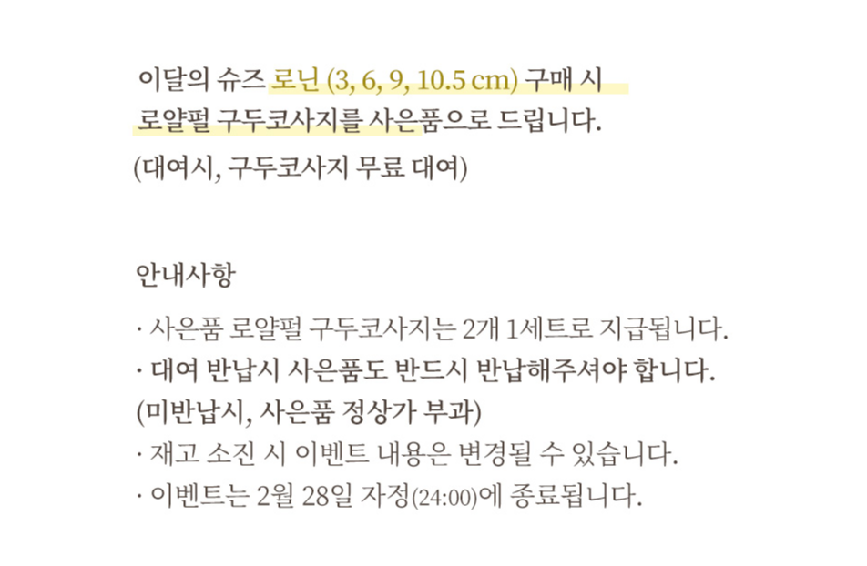 저는 키가 큰 편이라서, 예랑이랑 키 차이가 많은 편이 아니에요. 그래서 무조건 3cm!! 플랫슈즈를 찾고 있었습니다. 제가 딱 사려고 했던 기본형 3cm 플랫 구두가 마침 또 이벤트를 하고 있지 뭐예요~! 가장 무난해 보였던 로닌 디자인을 구매하거나 대여하면 코사지를 사은품으로 제공하고 있었습니다.