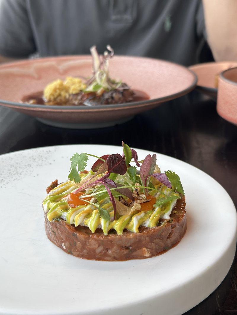 - 🐂 Aged beef tartare, spring onion, smoked mayo, roast garlic, prawn cracker → 육회의 고급진 버전