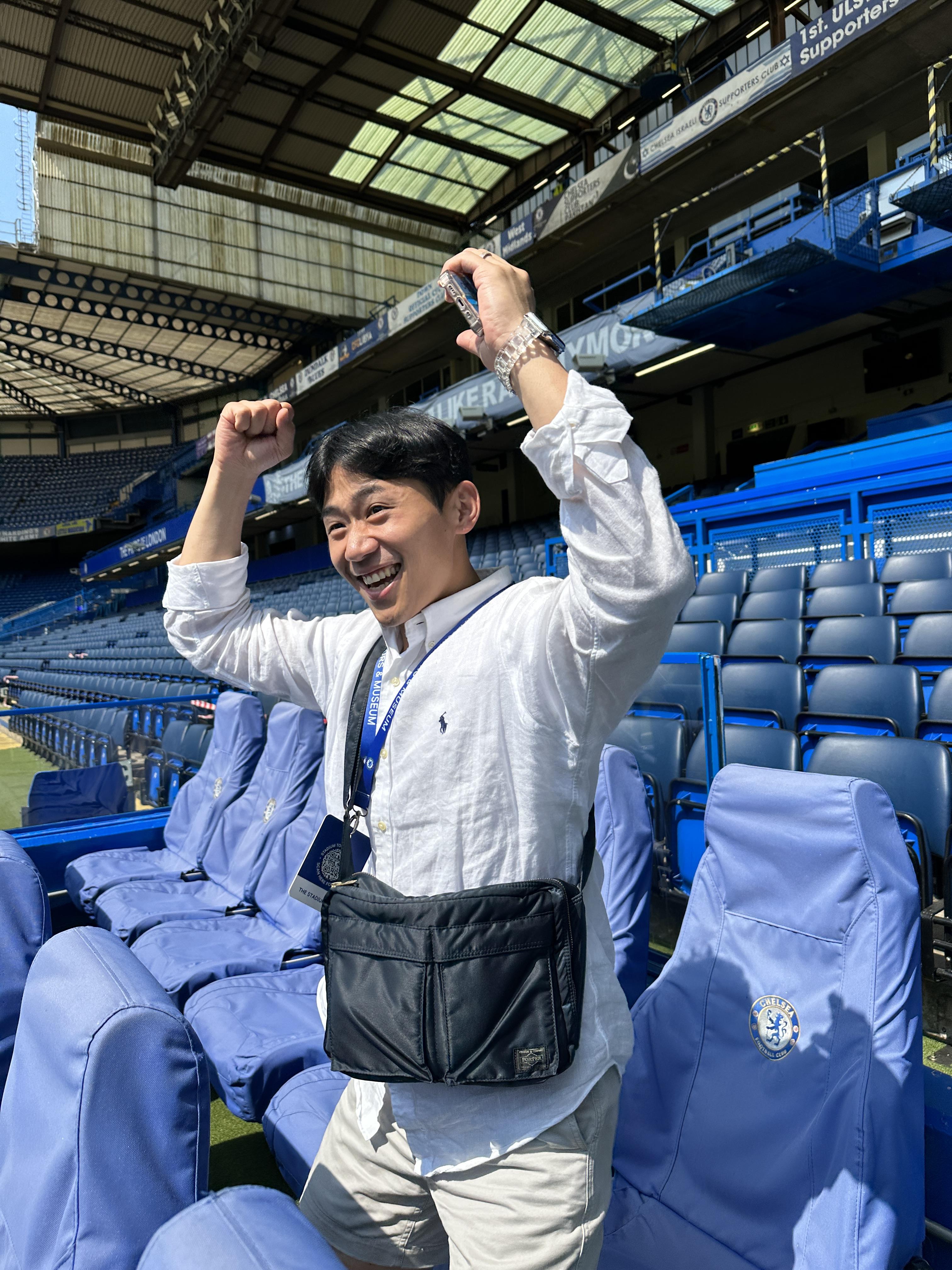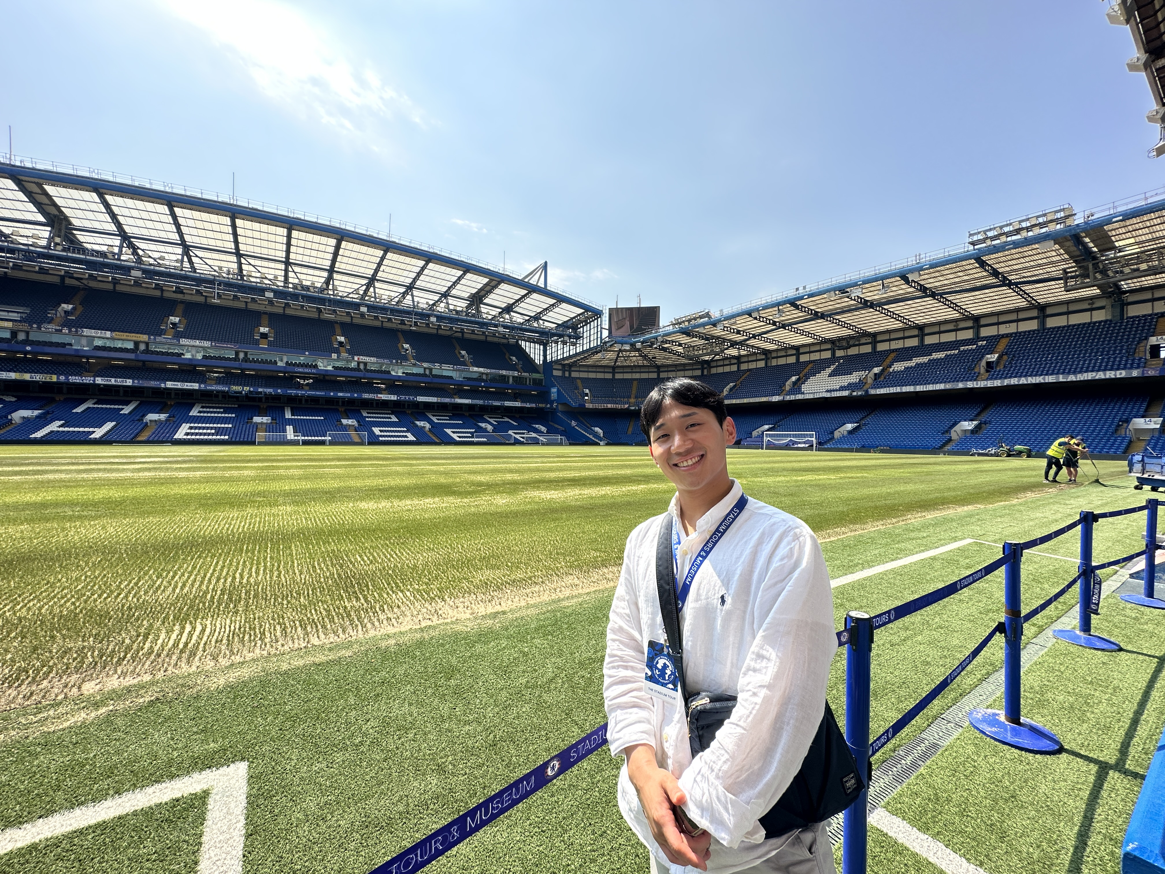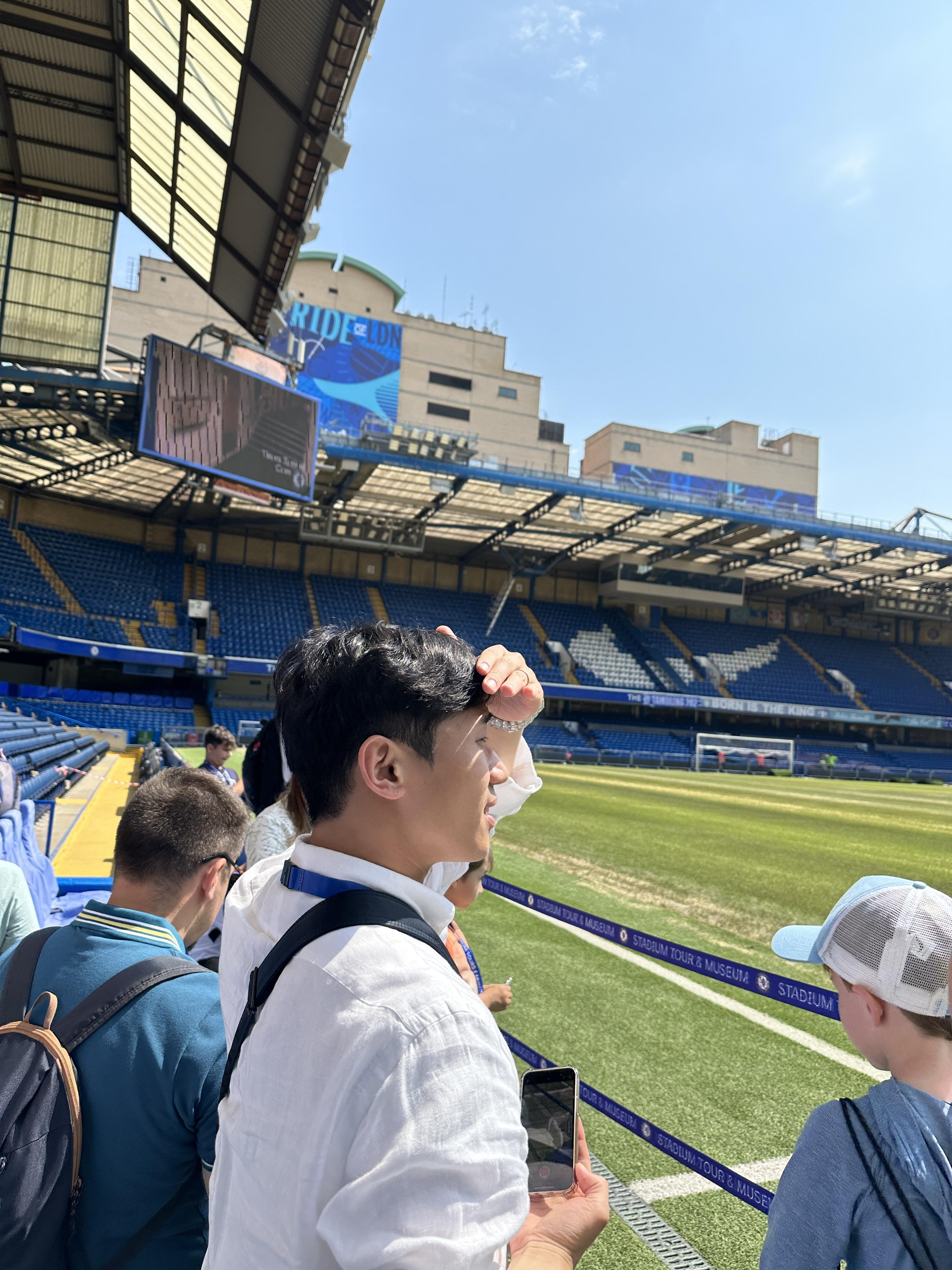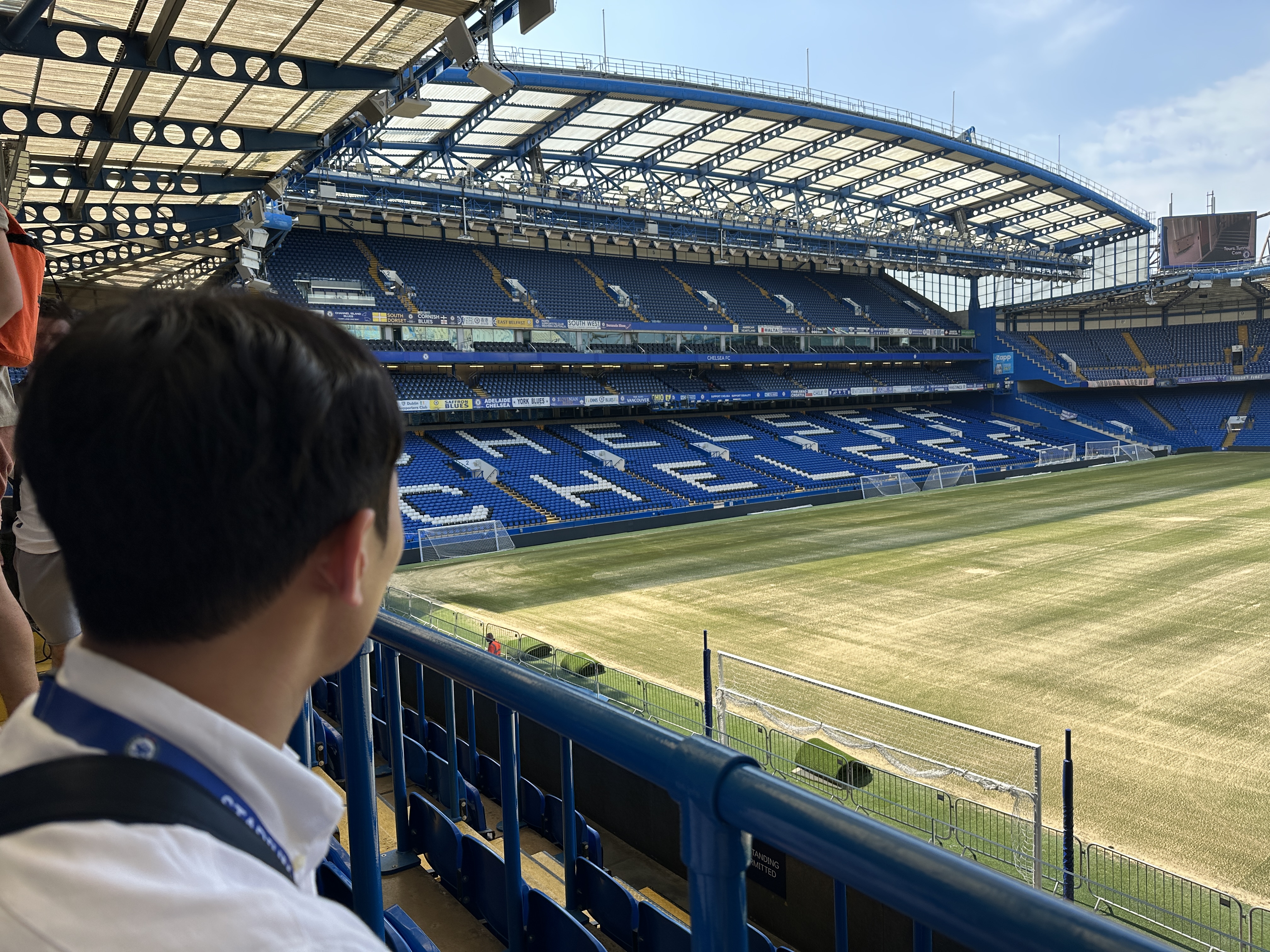 탈의실에서 나와 초록빛 경기장으로 연결되는 터널을 지나니 촤라라~ 경기 끝나고 군데군데 잔디 정비 중이더라고요. 투어 당일엔 햇살이 엄청 강렬했던 기억이 있어요. 그래서인지 잔디와 구장이 더 청량하고 푸르게 보여 너무 멋있었습니다. 홈팀과 어웨이팀 응원석 모두 앉아서 첼시 구단이 처음 만들어지게 된 일화 구장의 역사들을 찬찬히 설명 들었어요. 가이드 분께서도 (당연하겠지만?) 엄청 오래된 첼시 팬이시더라고요.