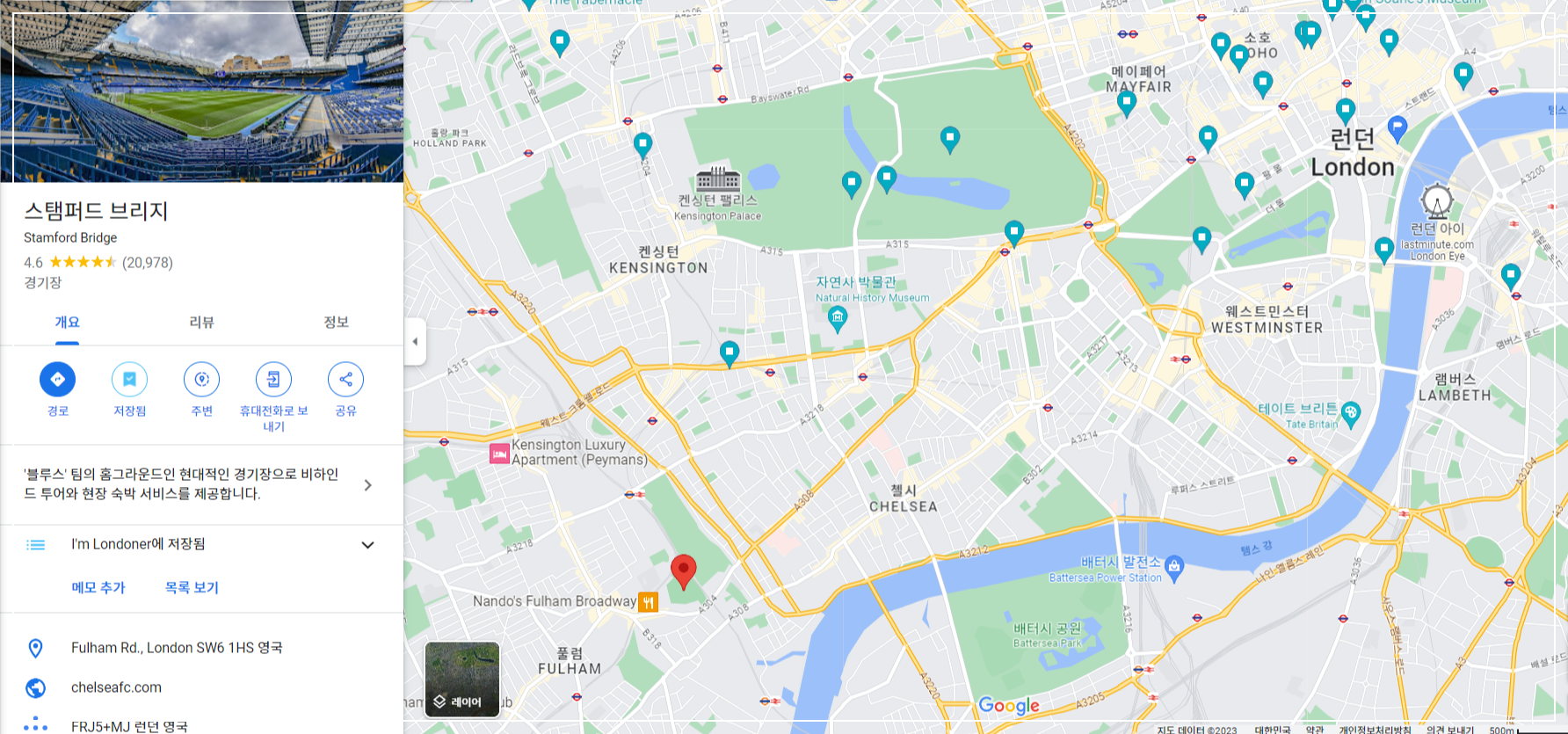 원래는 남편이 오래전부터 응원하던 아스날 홈 에미레이트 스타디움 투어를 예약하려 했지만, 저희가 여행 중인 기간 동안에 음악 콘서트가 잡혀 있어 풀 부킹이더라고요... ㅠㅡㅜ 대신 저희 숙소와 매우 매우 가 가운 첼시의 홈구장 Stamford Bridge 투어를 예약하기로 했어요. 저희 숙소가 켄싱턴에 있는 파크 인터내션널 호텔이었는데, 대중교통으로 15분 밖에 걸리지 않더라고요. 탬즈강을 끼고 북서쪽에 위치한 Stamford Bridge는 하이드파크, 캔싱턴 팰리스, 버킹엄 궁전, 노팅힐 등 관광지와 가까워요. 아래 구글 맵 URL로 자세한 위치를 확인해 보세요.
