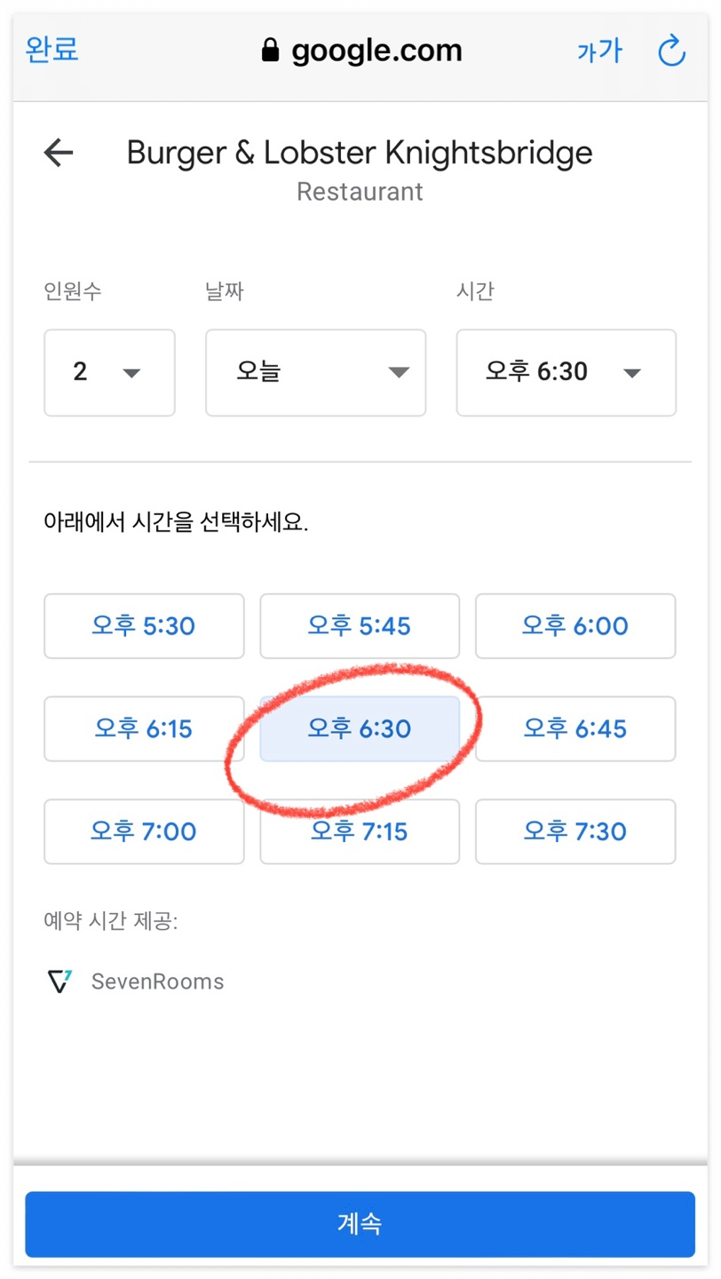 원하시는 인원수와 날짜, 시간을 클릭하고 계속 버튼을 눌러주세요.
