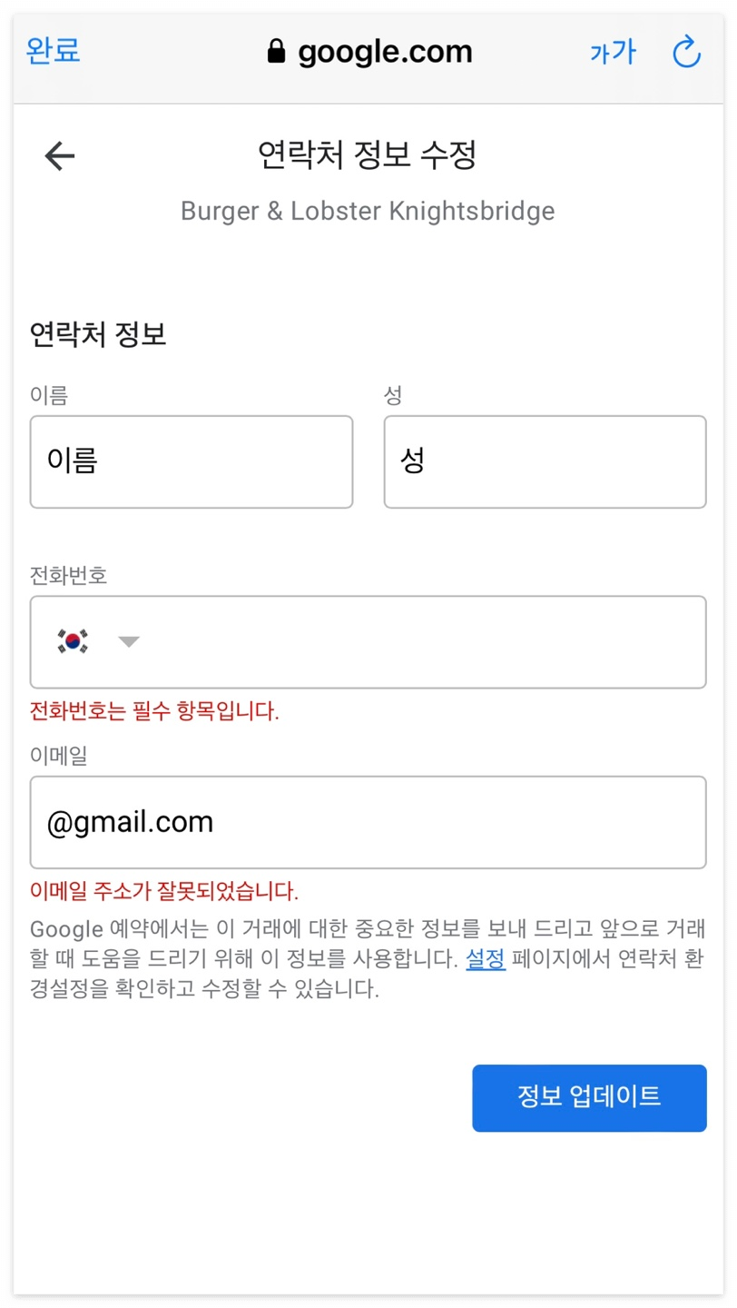 그럼 연락처를 입력하는 화면으로 넘어갔을 거예요. 연락처 이름은 영어로 적어주세요. 전화번호는 그리 중요하지 않으니 한국 휴대폰 번호를 입력하셔도 되어요.유심 구매하셔서 영국에서 사용하실 전화번호를 미리 아실 수 있는 경우엔 영국 번호를 입력합니다. 이메일 주소까지 적으셨다면, 정보 업데이트 버튼을 눌러주세요.